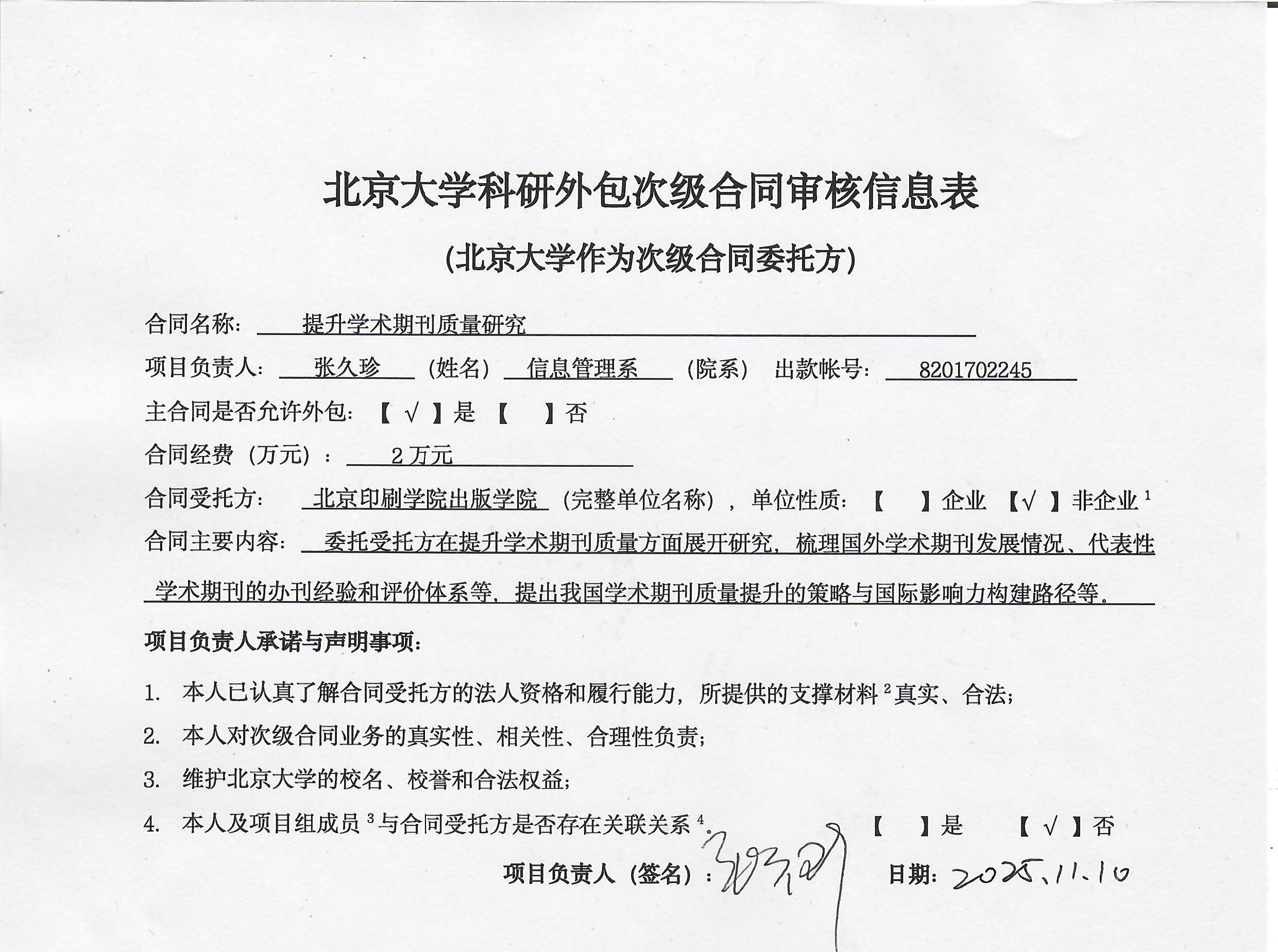 按照《北京大学科研外包次级合同管理办法》等文件的规定,现将张久珍老师负责的《提升学术期刊质量研究》课题外包次级合同情况予以公示,详细内容见附件。